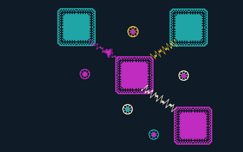 Click the nodes to move. Use the Bloom nodes to spread its centre color to all the objects in the world. The outer ring decides which objects will be affected. In this example, all blue objects in the world will turn purple.